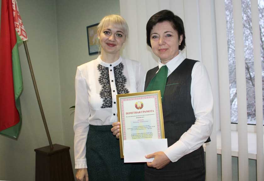 Ганаровую грамату Дзятлаўскага райвыканкама Вольга Антонаўна ўручыла галоўнаму спецыялісту сектара рознічнага і карпаратыўнага бізнесу Надзеі Мазоль. Такая ж узнагарода перададзена спецыялісту па аказанні рознічных банкаўскіх паслугаў Святлане Вайчык .