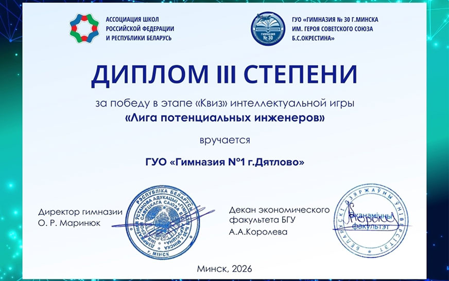 Навучэнцы інжынернай групы 11 класа гімназіі № 1 горада Дзятлава пад кіраўніцтвам настаўніцы Святланы Кетка прынялі ўдзел у інтэлектуальнай гульні “Ліга патэнцыйных інжынераў”, якая праходзіла пад эгідай Асацыяцыі школ Расіі і Беларусі.