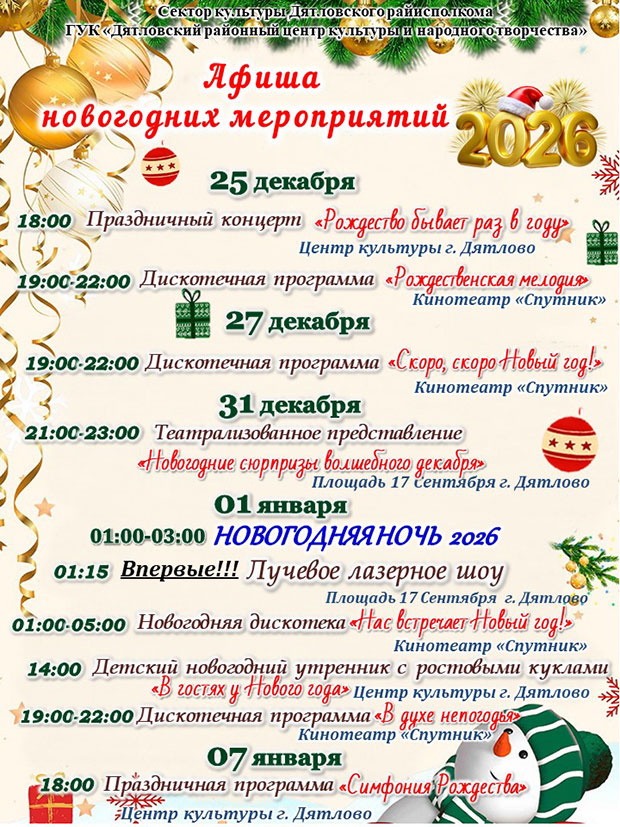 Важнае Да ведама грамадзян 1 min read 1427 Афиша новогодних мероприятий administrator 29 декабря, 2025 0 Подписывайтесь на телеграм-канал «Дятлово ОНЛАЙН» по короткой ссылке @gazeta_peramoga