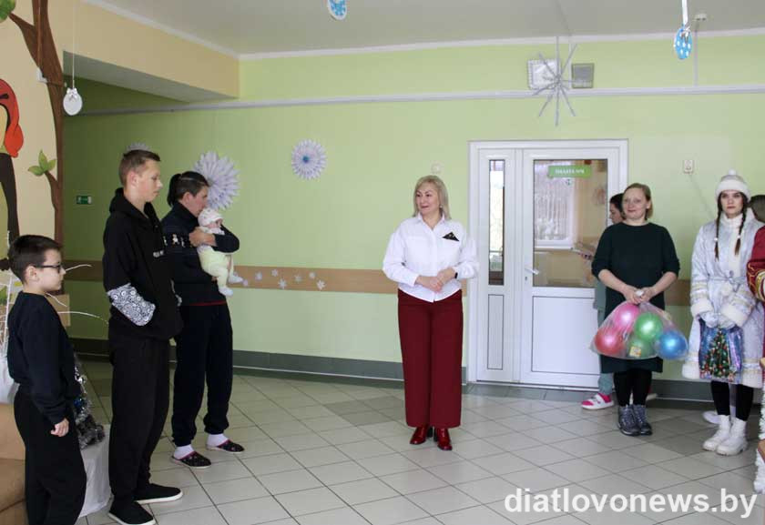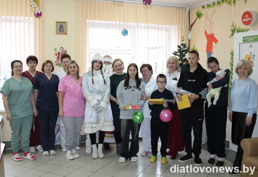 З цацкамі, настольнымі гульнямі, салодкімі прысмакамі да пацыентаў дзіцячага аддзялення Дзятлаўскай цэнтральнай раённай бальніцы завіталі ў госці начальнік аддзела адукацыі райвыканкама Марына Лашкоўская, старшыня раённага аддзялення Беларускага дзіцячага фонду Алена Чайкоўская, яе намесніца Марына Гуговіч і, вядома ж, усімі любімыя Дзед Мароз са Снягуркай.