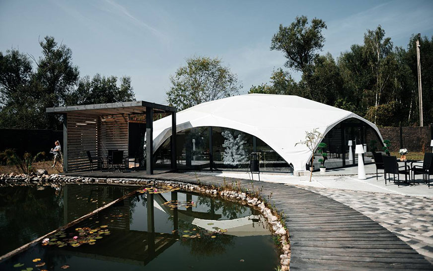 - Широкий выбор. В каталоге аренды можно найти шатры разного размера, формы и уровня комфорта – от простых тентовых навесов до модульных конструкций с остеклением и климат-контролем.