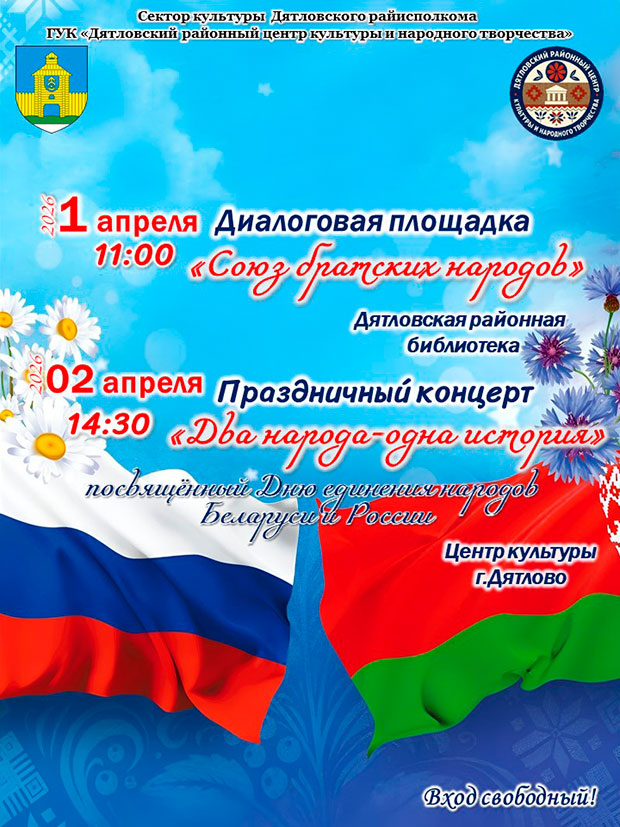 Важнае Да ведама грамадзян 1 min read 716 День единения народов Беларуси и России. Афиша administrator 1 апреля, 2026 0 Подписывайтесь на телеграм-канал «Дятлово ОНЛАЙН» по короткой ссылке @gazeta_peramoga