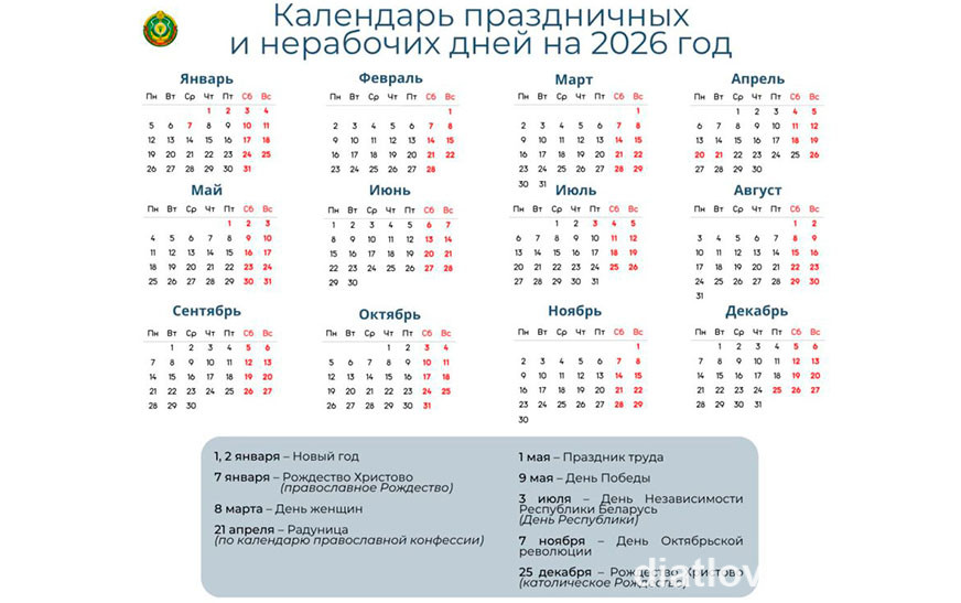 В какие дни в 2026 году белорусы будут официально отдыхать, БЕЛТА рассказали в Министерстве труда и социальной защиты.