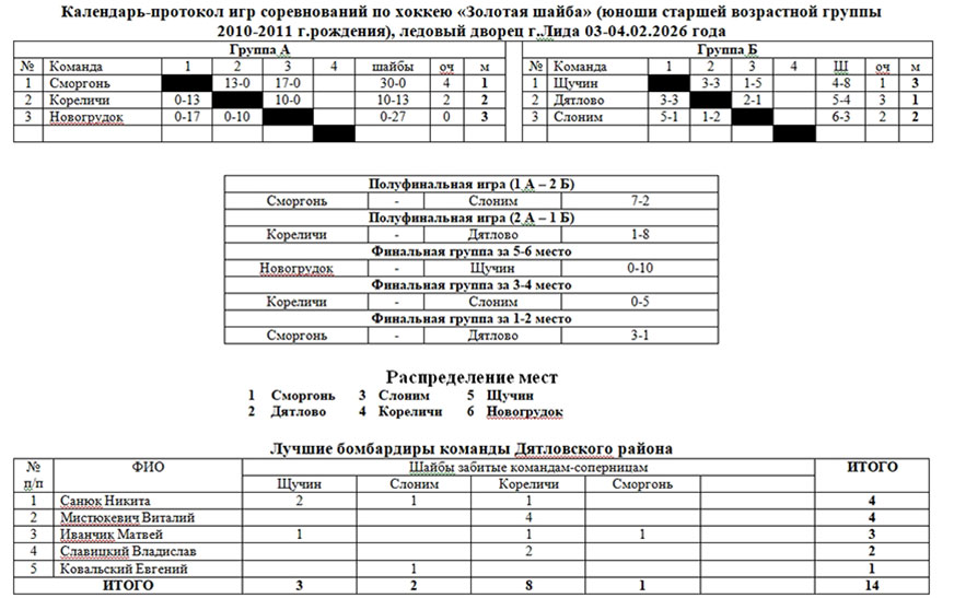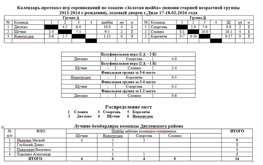 Многія з іх прынялі ўдзел у абласным этапе спаборніцтваў “Залатая шайба”, які ў лютым праходзіў у Лядовым палацы горада Ліды. Каманды раёна пазмагаліся за перамогу ў абодвух турнірах: сярод юнакоў старэйшай (2010-2011 гадоў нараджэння) і малодшай (2012-2014 гадоў нараджэння) узроставых груп, у фінале якіх саступілі сваім сапернікам і заваявалі тытул віцэ-чэмпіёнаў. Пераможцамі турніраў і ўладальнікамі пуцёвак на рэспубліканскі этап спаборніцтваў сталі каманды са Смаргонскага (у старэйшай узроставай групе) і Слонімскага (у малодшай) раёнаў. У кожным з турніраў нашы хакеісты на шляху да фіналу абыгралі па тры каманды. У старэйшай групе – са Шчучынскага, Слонімскага і Карэліцкага раёнаў, а ў малодшай – з Навагрудскага, Смаргонскага і Шчучынскага. Усяго ў двух турнірах гульцы “Алмаза” закінулі 28 шайбаў (па 14 у кожнай групе), прапусцілі 16 (па 8 у кожнай групе). Лепшымі бамбардзірамі ў саставе раённай каманды ў старэйшай групе сталі Мікіта Санюк (капітан каманды) і Віталь Місцюкевіч, на рахунку якіх па 4 шайбы. Таксама вызначыліся галамі Мацвей Іванчык (3 шайбы), Уладзіслаў Славіцкі (2), Яўген Кавальскі (1 шайба). У малодшай узроставай групе лепшым бамбардзірам стаў Мацвей Іванчык (капітан каманды) – 9 шайбаў, галамі вызначыліся Дзяніс Глубокі, Аляксандр Харошка (у абодвух па 2 шайбы) і Васіліса Панасевіч (1 шайба). Хочацца адзначыць варатара малодшай групы Сяргея Юргеля, які ў двух з чатырох згуляных матчаў не прапусціў ніводнай шайбы. Пажадаем камандам-пераможцам дастойна прадставіць Гродзеншчыну на Рэспубліканскім этапе спаборніцтваў “Залатая шайба”.
