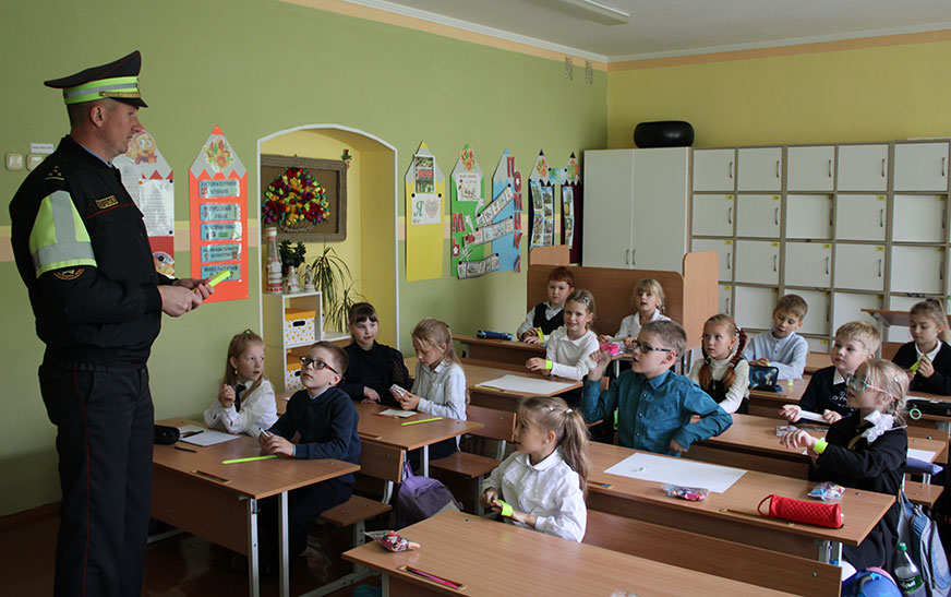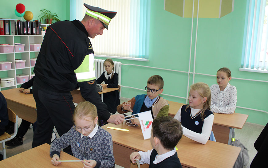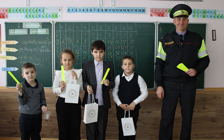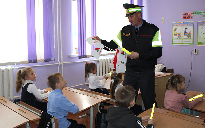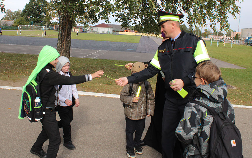 Яны нагадалі дзецям, што дзеля сваёй бяспекі ў цёмны час сутак на вуліцы неабходна абавязкова пазначаць сябе святлоадлюстроўваючымі элементамі.