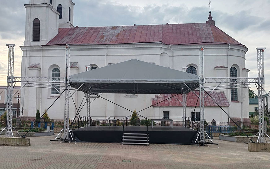 У склад канструкцыі ўваходзіць хуткаразборны сцэнічны дах (павільён) для подыума памерам 10 х 8 метраў з вышынёй пад’ёму даху 6,5 метра і двума парталамі шырынёй па 4 метры, з лесвіцамі і агароджамі. Зроблены ён са спецыяльнага алюмініевага сплаву, дах – з ПВХ. Дарэчы, пры выкананні мерапрыемстваў па размяшчэнні баластнай нагрузкі і фіксацыі комплексу ён будзе ўстойлівы пры ветры да 27,8 метраў у секунду. Вытворца яго беларускі – прыватнае вытворча-гандлёвае ўнітарнае прадпрыемства “ПрамКамплектЦэнтр” з горада Новалукомля Віцебскай вобласці, спецыялісты якога самі праводзілі і зборку комплексу. Канструкцыя гэтая надзейная, бо рэалізоўвалася з актамі выпрабаванняў трываласці яе частак, пажарнымі сертыфікатамі.