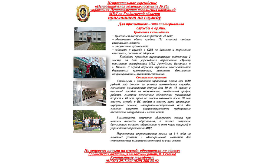 Важнае Да ведама грамадзян 1 min read 1491 Исправительное учреждение «Исправительная колония-поселение № 26» управления Департамента исполнения наказаний МВД по Гродненской области приглашает на службу administrator 10 февраля, 2026 0 Подписывайтесь на телеграм-канал «Дятлово ОНЛАЙН» по короткой ссылке @gazeta_peramoga
