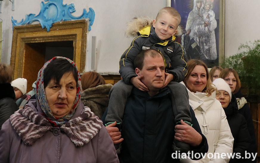 Вячэрнюю літургю наведалі парафіяне – жыхары райцэнтра і госці, якія прыехалі на святы да родных. Яны прыйшлі цэлымі сем’ямі, каб перажыць гэтыя радасныя хвіліны разам.