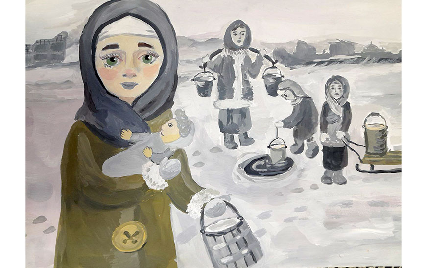 – Работа Ульяны Гліністай – гэта выява дзяўчынкі з лялькай у руках, якая перажывае блакаду ў ваенным Ленінградзе і прыйшла на возера па ваду, – расказала педагог навучэнкі Жанна Лукашэня.