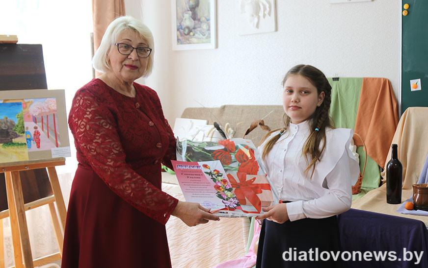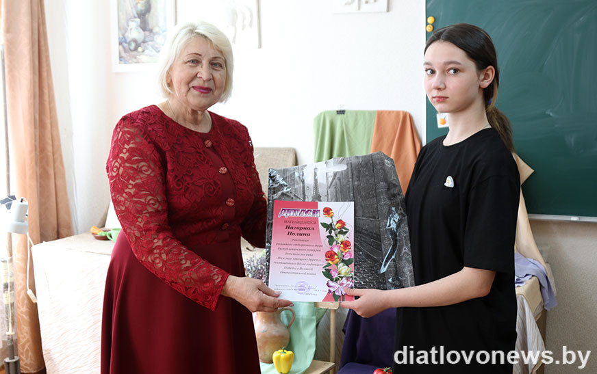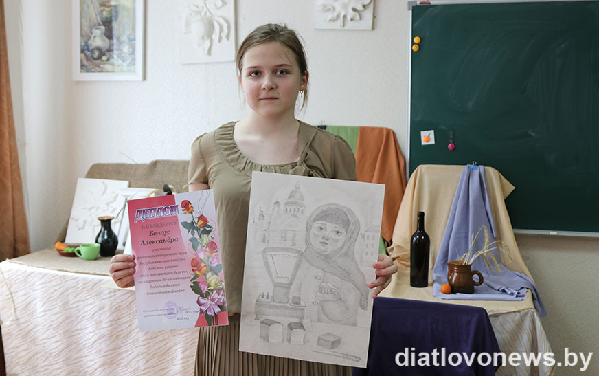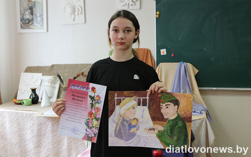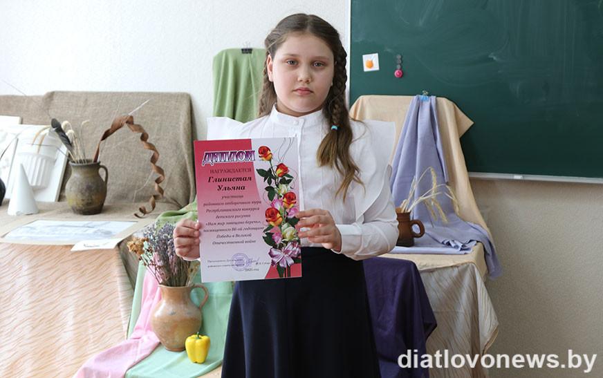 – Штогод наша ветэранская арганізацыя запрашае таленавітых школьнікаў далучацца да конкурсу “Нам мір завешчана берагчы”, – расказала Ядвіга Міхайлаўна. – Праз сродкі выяўленчага мастацтва, фантазію ў падрастаючага пакалення фарміруюцца паважлівыя адносіны да памяці абаронцаў Айчыны, гераічнага подзвігу воінаў, выхоўваюцца такія маральныя якасці, як гераізм, сяброўства, патрыятызм, любоў да Радзімы. Вось і сёлета мы прапанавалі для ўдзелу тэматычныя намінацыі “Яны змагаліся за Радзіму”, “Дарагія мае ветэраны”, “Свята Перамогі вачамі дзяцей”, “Мая сям’я і Вялікая Перамога”, “Дзеці малююць герояў Вялікай Айчыннай вайны”. Малюнкі падрыхтавалі навучэнцы трох установаў: Дзятлаўскай, Новаяльнянскай, Гезгалаўскай дзіцячых школаў мастацтваў пад кіраўніцтвам педагогаў Жанны Лукашэні, Алены Гайдук, Аляксандры Жылянінай. Малюнкі Ульяны Гліністай (Дзятлава), Маргарыты Кастусік і Валерыі Русакевіч (Гезгалы) былі адабраны для ўдзелу ў абласным этапе конкурсу. Гродзенскае журы вылучыла сярод работ юных жыхароў Прынёмання тыя, якія будуць прадстаўляць наш рэгіён у рэспубліканскім фінале. У іх лік увайшоў і малюнак Ульяны Гліністай, таму мы можам ганарыцца нашай таленавітай зямлячкай.