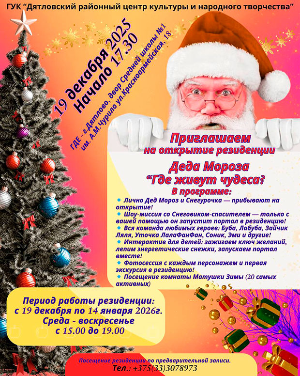 Важнае Культура і адпачынак 1 min read 3149 Приглашаем на открытие резиденции Деда Мороза administrator 7 декабря, 2025 0 Подписывайтесь на телеграм-канал «Дятлово ОНЛАЙН» по короткой ссылке @gazeta_peramoga