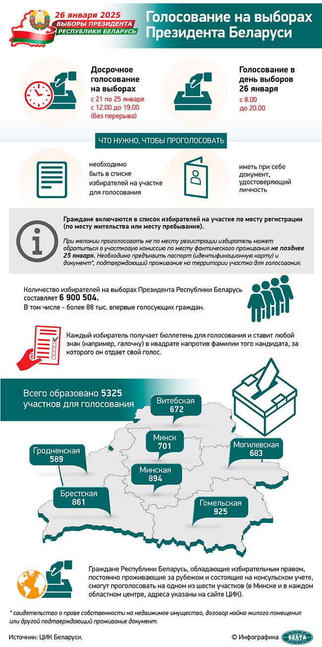 На территории страны образовано 5325 участков для голосования. Избиратели, включенные в списки, смогут получить бюллетень для голосования при предъявлении паспорта (ID-карты). Кроме того, можно предоставить и другой документ, который подтверждает личность, – водительское удостоверение, удостоверение инвалида (если в нем есть фото) или пенсионное удостоверение. Для военнослужащих срочной службы предусмотрено предоставление военного билета, для работников государственных органов и организаций – служебного удостоверения. Если гражданин утерял паспорт (ID-карту) или их похитили, то органы внутренних дел выдают соответствующие справки, которые подтверждают личность. Молодежь может проголосовать по студенческому билету или билету учащегося.