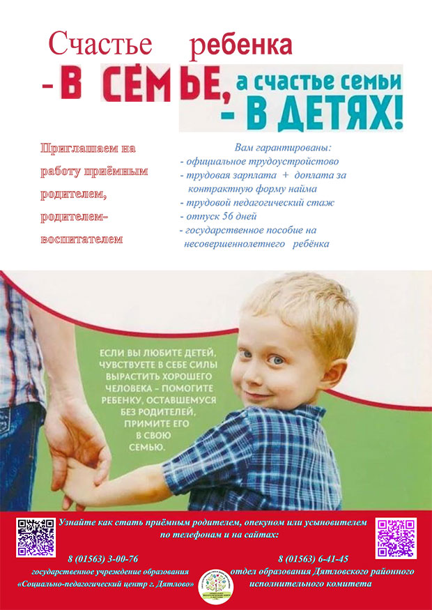 Адміністрацыя цэнтра звяртаецца да дзятлаўчан: паважаныя жыхары раёна, калі вашы сэрцы адкрыты для дзяцей, якія па розных прычынах засталіся без бацькоў, калі вы гатовы падарыць дзіцяці сям’ю і шчаслівае дзяцінства, мы запрашаем вас стаць замяшчальнымі бацькамі.