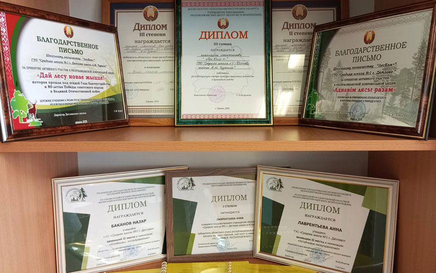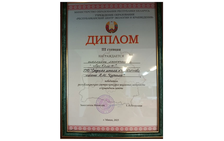 Дыплом трэцяй ступені Міністэрства адукацыі ў рэспубліканскім аглядзе-конкурсе школьных лясніцтваў-2025 заваявалі ўдзельнікі “ЛесКам+” – школьнага лясніцтва сярэдняй школы № 1 горада Дзятлава імя А. М. Чурылы, кіраўнік – Наталля Белаус.