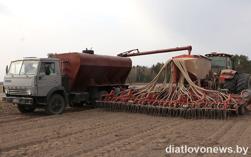 На ўскрайку поля сеялку для загрузкі чакае КамАЗ, якім кіруе Руслан Палуносік. Два разы на дзень ён ездзіць атрымліваць насенне на склад, у полі нароўні з механізатарам удзельнічае ў працэсе загрузкі сеялкі. Для яго работа ў полі зразумелая, звыклая і прыемная: