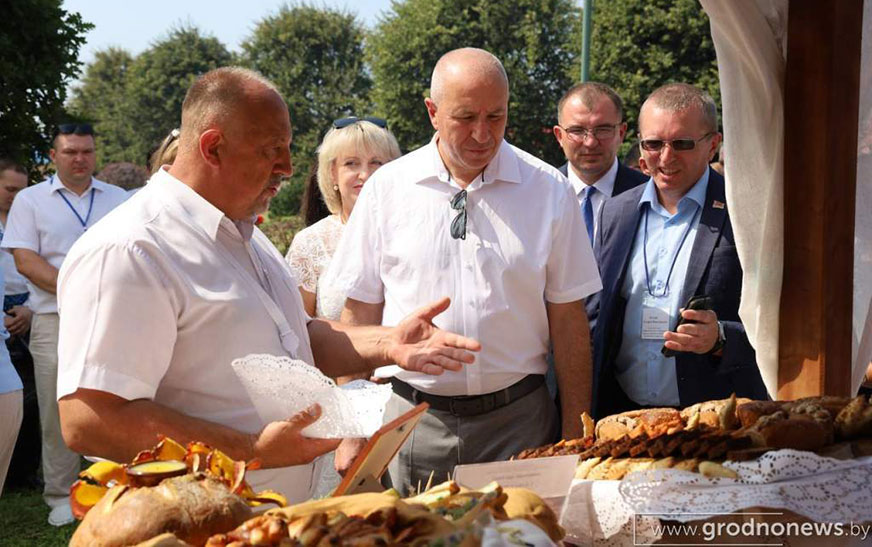 В рамках каравай-феста «Бацькава булка» председатель Гродненского облисполкома Юрий Караев и другие почетные гости посетили выставку-конкурс «Бацькау́шчына», ставшую настоящим центром кулинарного мастерства.