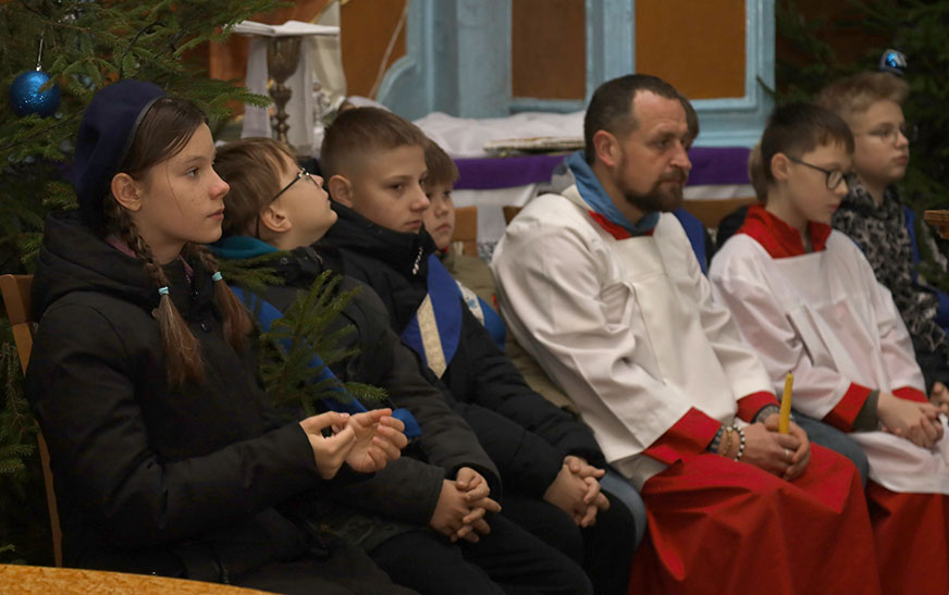 Удзельніцы руху “Каталіцкія скаўты” расказалі пра свой рух і тое, чым займаюцца. Адной з галоўных іх місій з’яўляецца дастаўка Віфлеемскага агню ва ўсе касцёлы Беларусі. У гэты дзень яны са сваёй місіяй наведалі набажэнствы ва Уселюбе, Навагрудку і нарэшце прыбылі да нас.