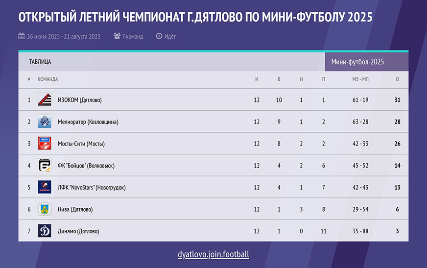 12 августа завершился 15-й открытый летний чемпионат города Дятлово по мини-футболу среди трудовых коллективов и любительских команд. Турнир проходил с 26 июня по 12 августа, в котором принимали участие 7 команд: